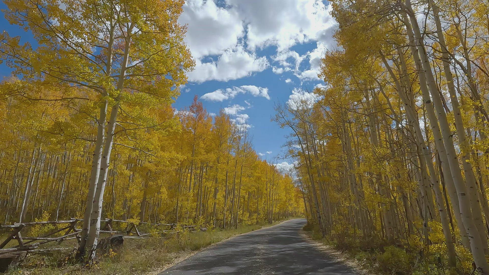 2135435 - Driving on road cutting through thick forest of Aspen trees with yellow leaves