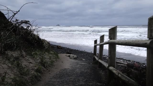 Aerial of the coast, rolling over hillside with trees back onto sand beach