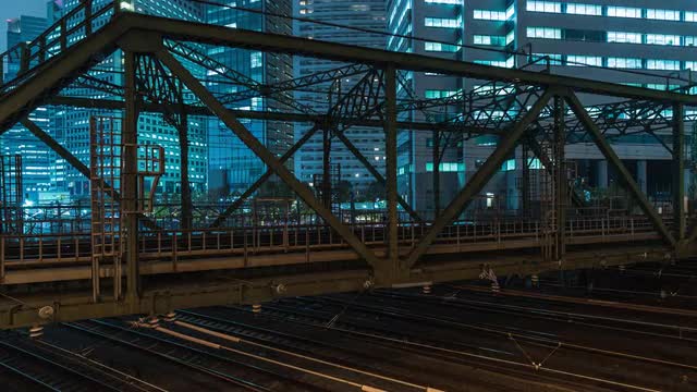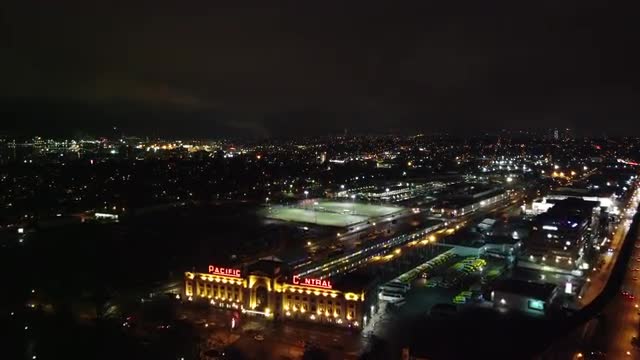 Commuter train moving slowly in the city at night. It arriving to its station, lighted building in background