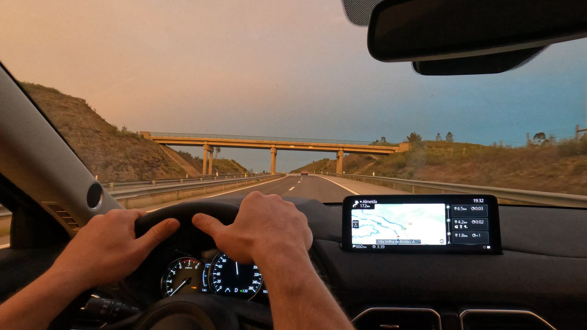 Close-up shot of car driving with dashboard view. Low speed can be seen on speedometer