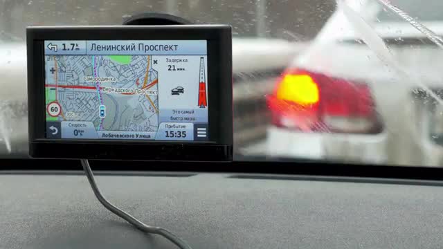MOSCOW, RUSSIA - FEBRUARY 4, 2015: Timelapse and close-up shot of car standing in traffic jam or at traffic lights. GPS device showing route, wipers washing dirty windscreen