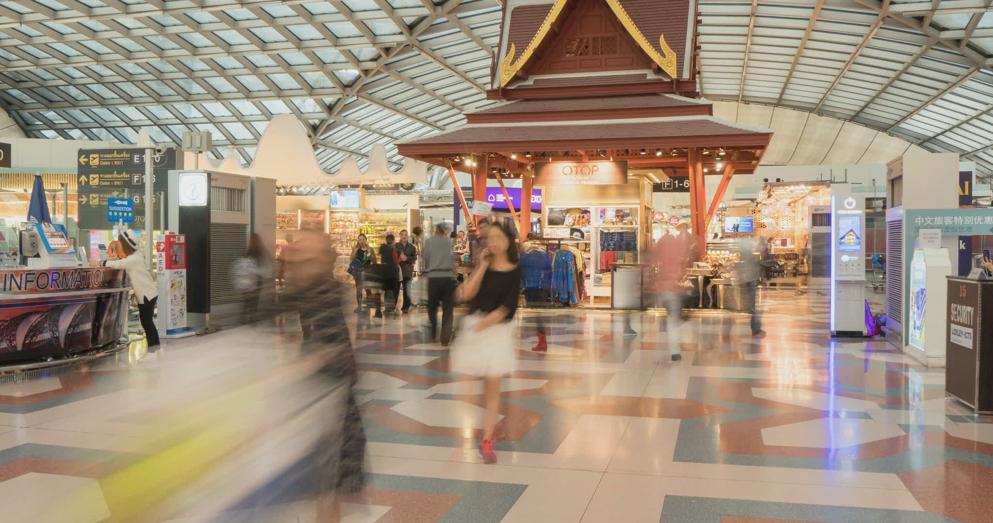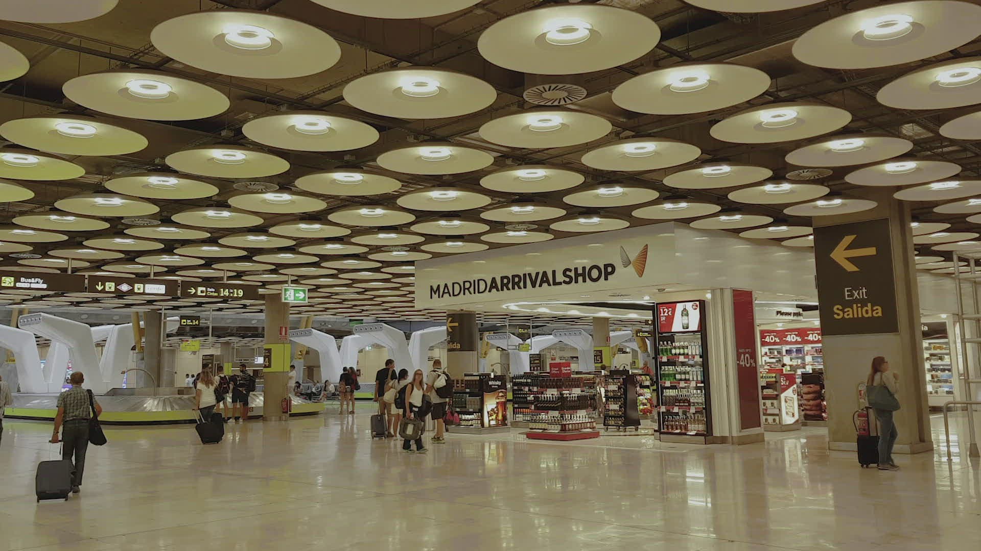 MOSCOW, RUSSIA - FEBRUARY 8, 2015: Steadicam shot of a woman with yellow trolley bag walking in duty free area in Vnukovo Airport