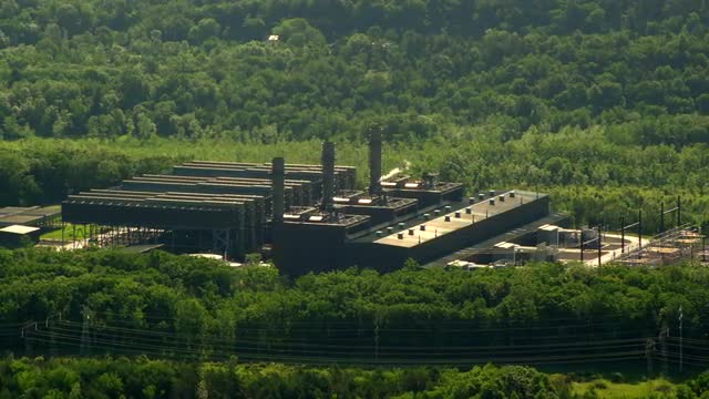 > WIDE AERIAL factory with smokestacks in rural area