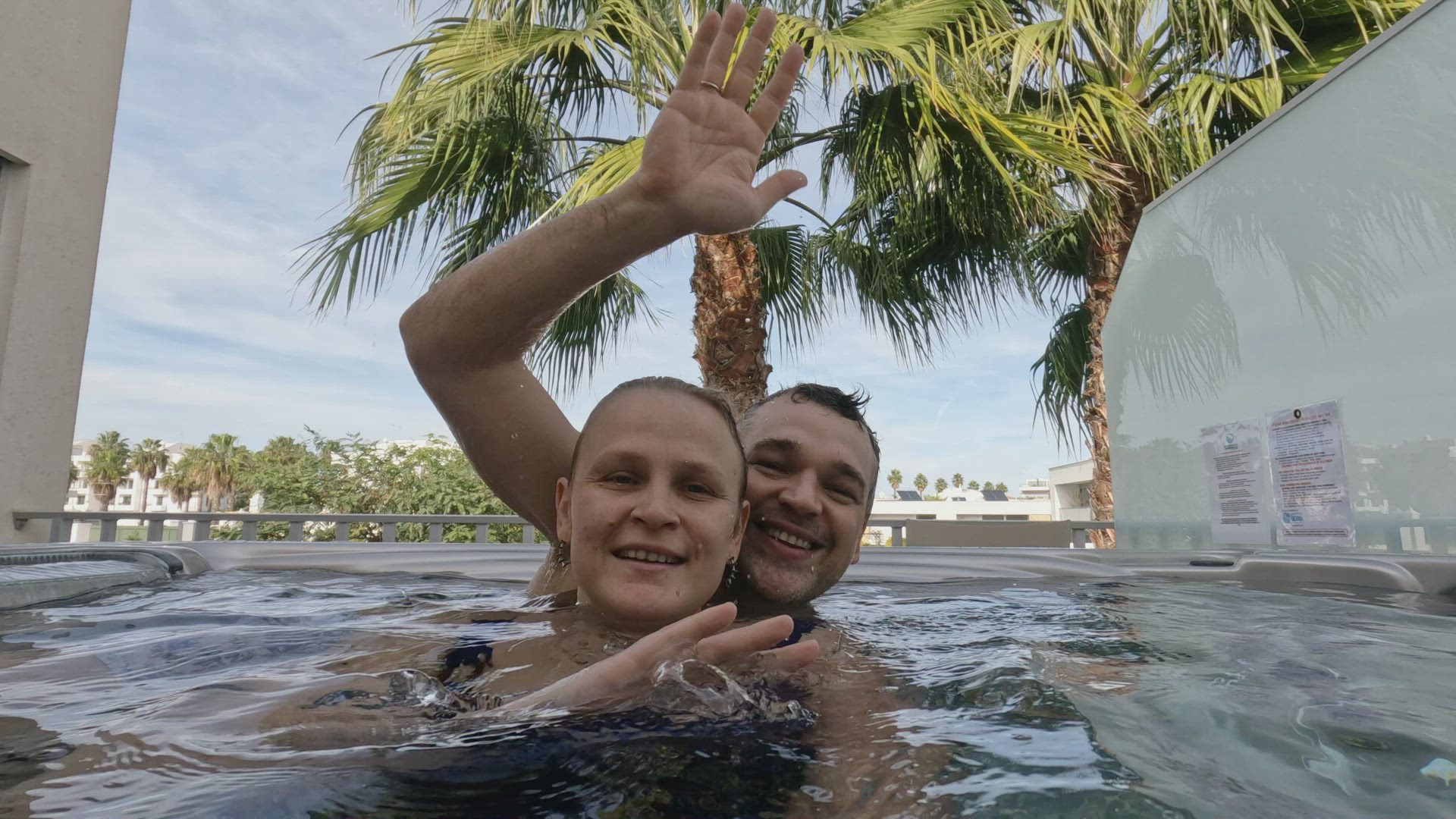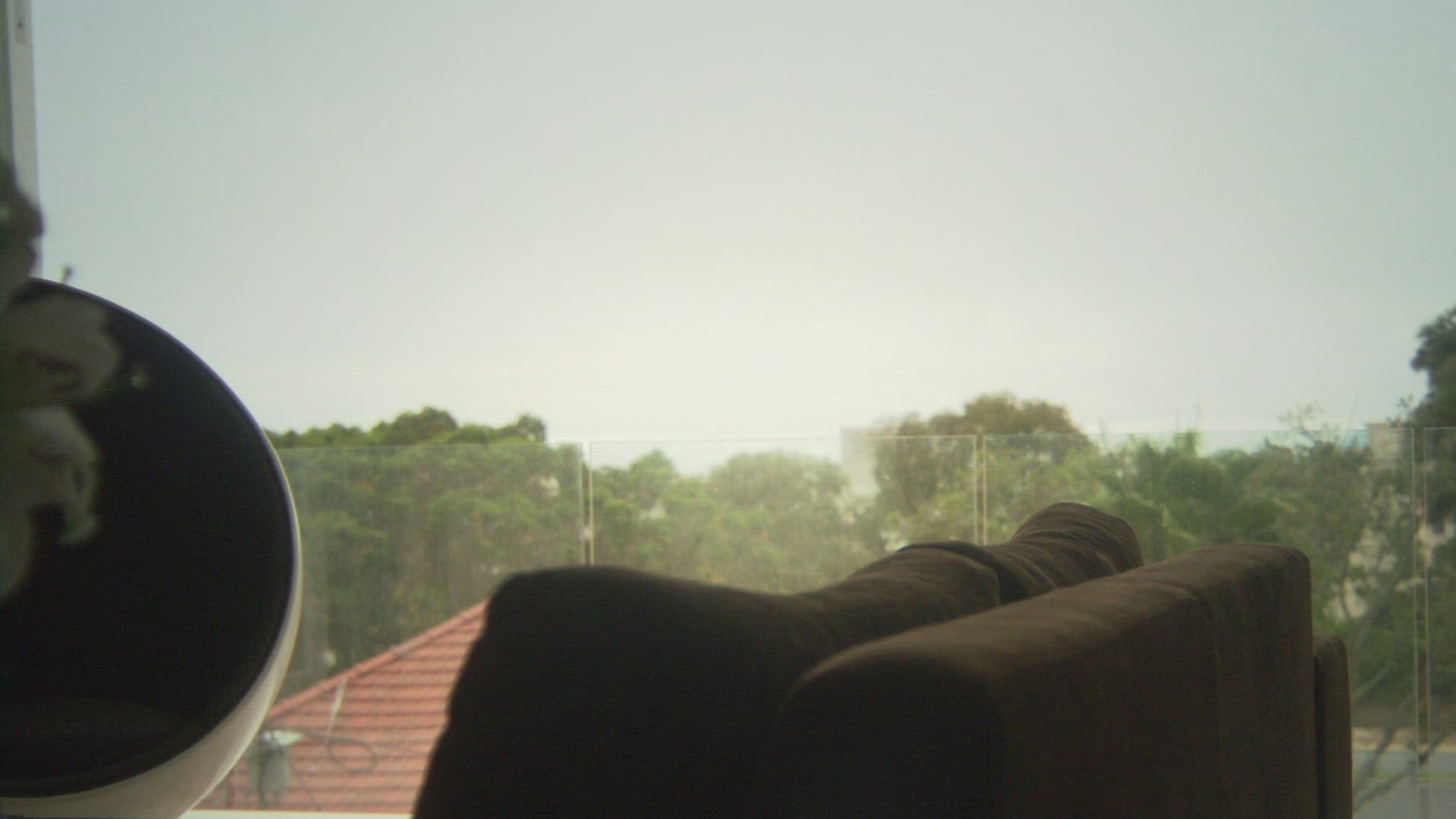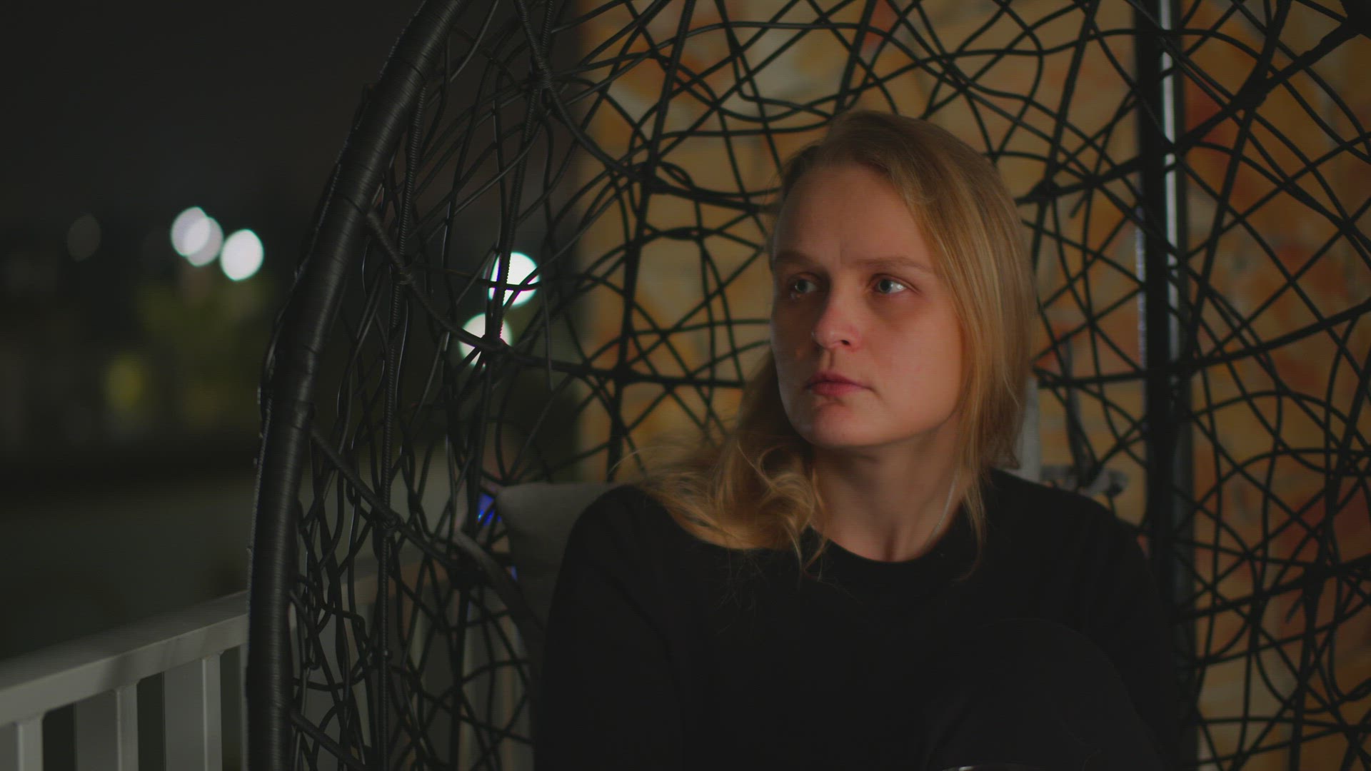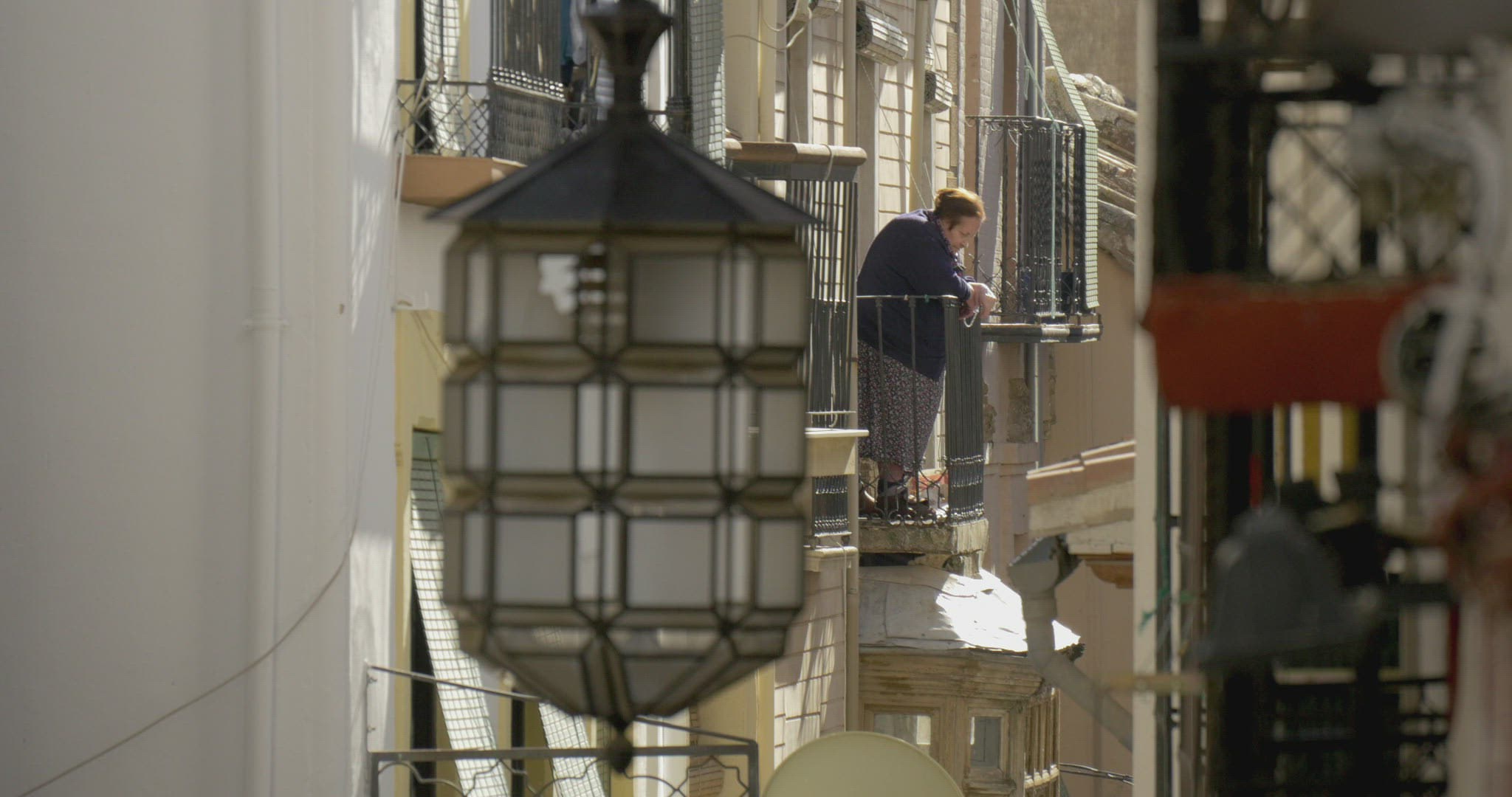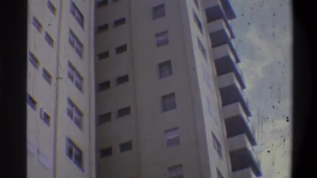 Dolly shot of a woman on the balcony with retro camera. She taking pictures or making video of city view