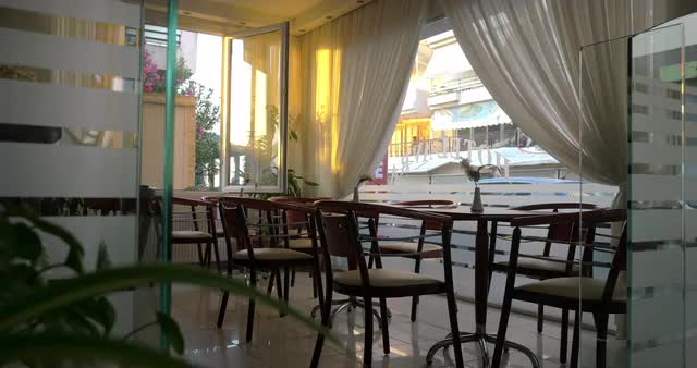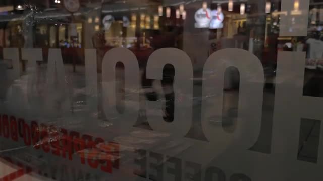 Slight defocus of city street with walking people. View through the cafe or restaurant window