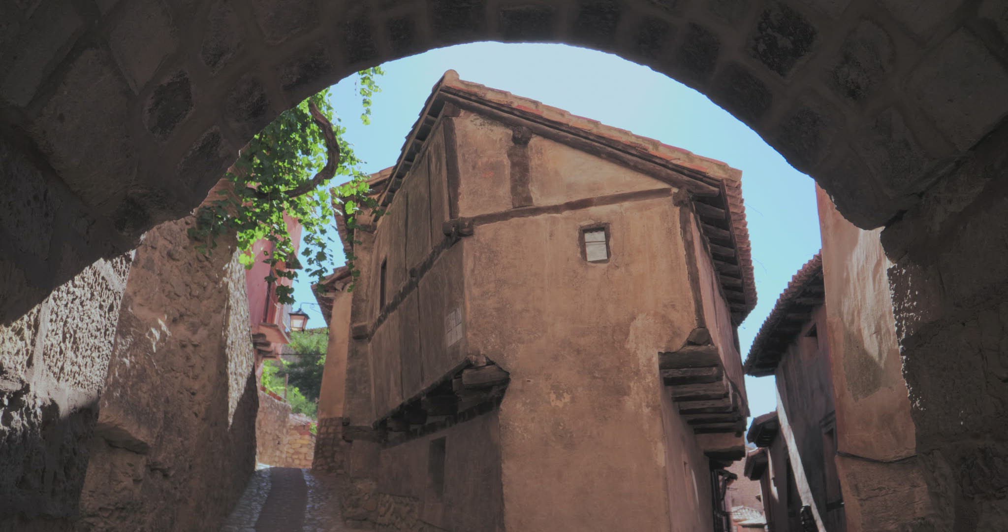 Steadicam shot of an old building wall with archway in Venice, Italy. Young woman walks through the archway holding her touch pad in hands. She stops on stairs to type in a message.