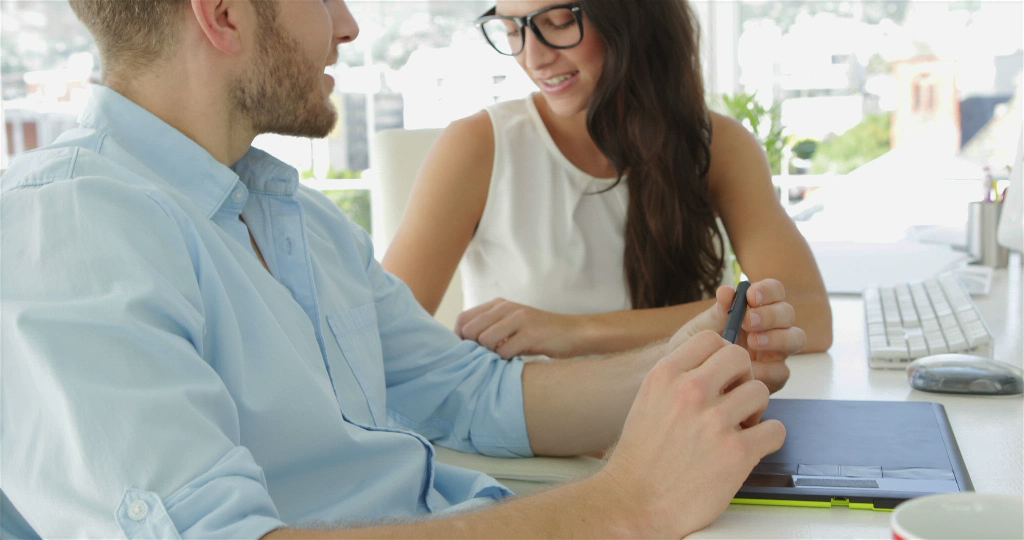 Young woman is sitting in cafe and drinking tea. She is chatting with friend via her tablet PC lying on the table and using stylus.