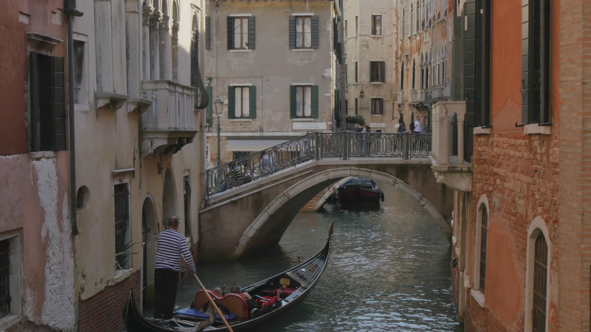 Tourists Sailing in Gondola along the Water Canal in Venice, Italy