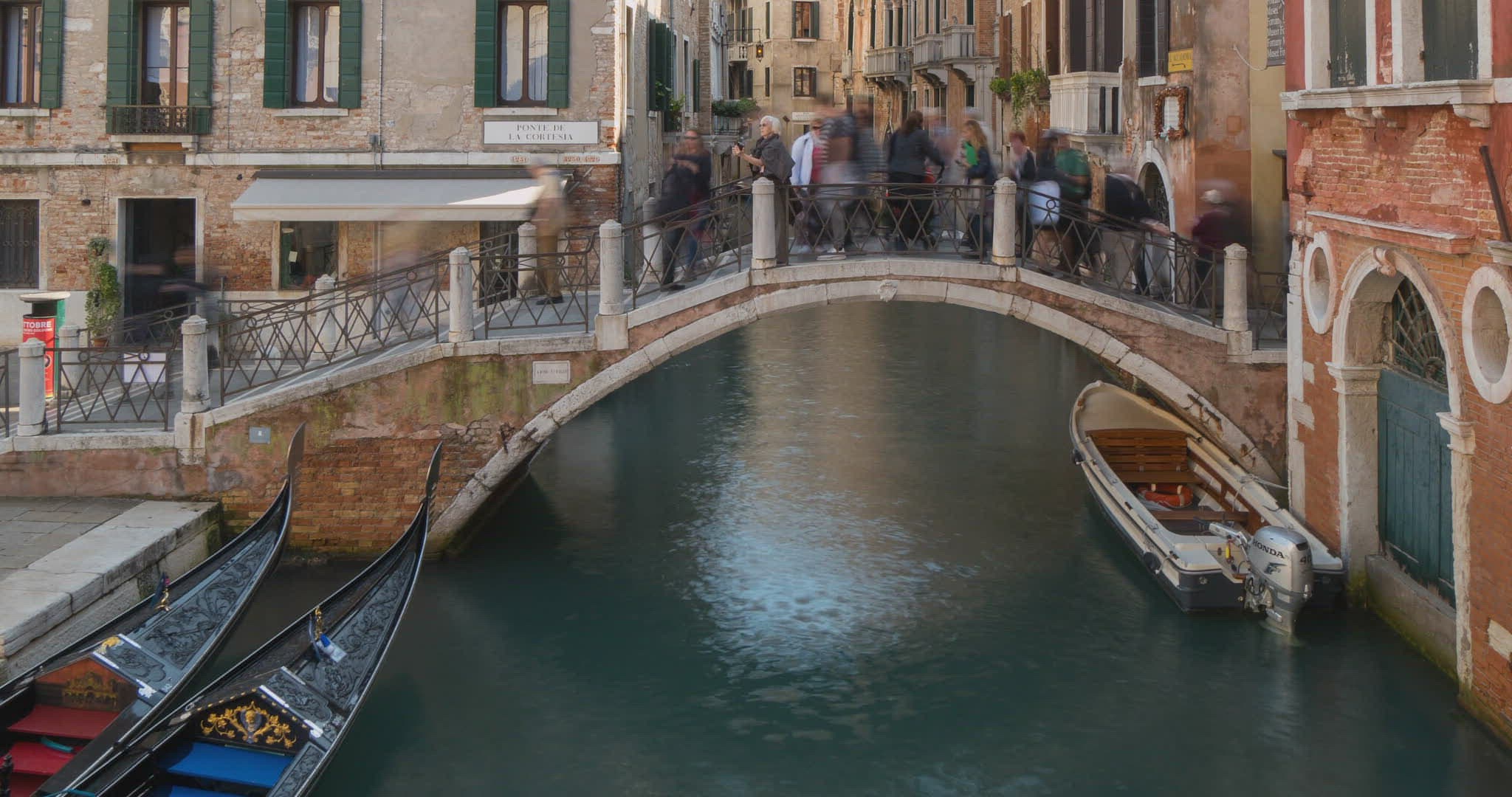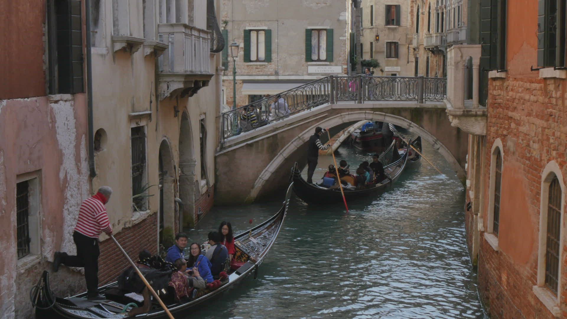 > Tourists Sailing in Gondola along the Water Canal in Venice, Italy
