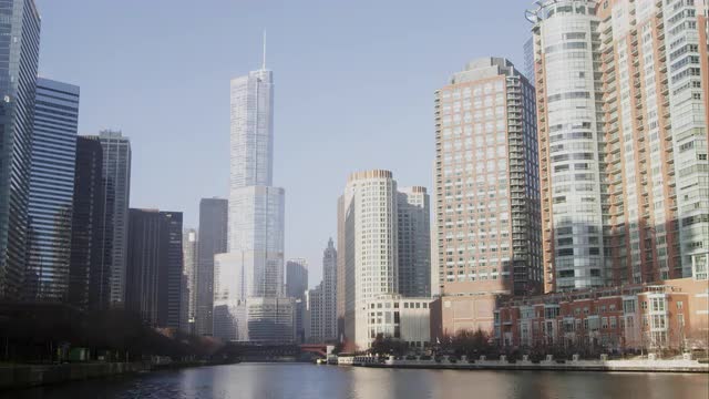 527235 - Time lapse shot of downtown Chicago featuring the Trump building and a barge on the river.