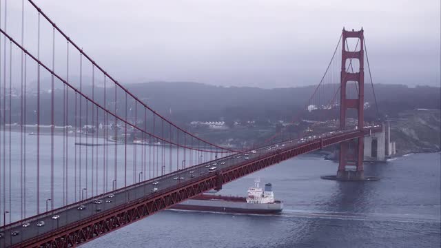 560702 - Medium tight static shot of the Golden Gate Bridge as a shipping barge goes under.