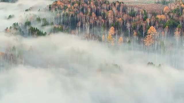 Autumn forest in the fog. Time Lapse