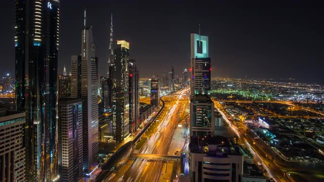 > Sheikh Zayed Rd, traffic and new high rise buildings along Dubai's main road, Dubai, United Arab