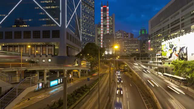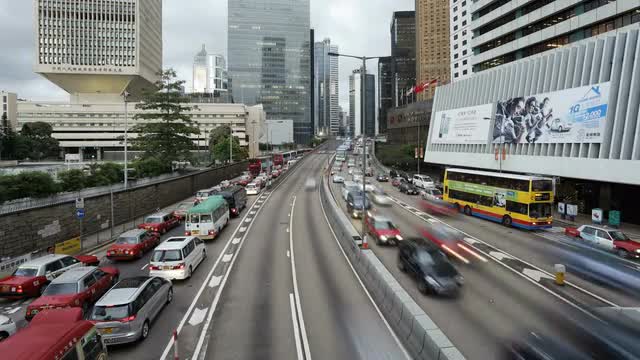 > Traffic and trams time-lapse along the Queensway in Central, Hong Kong, China,