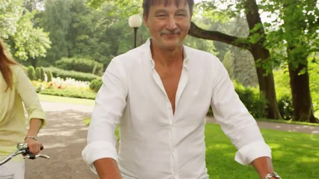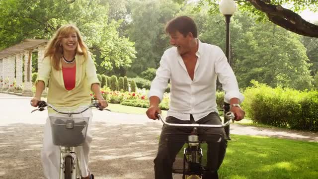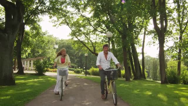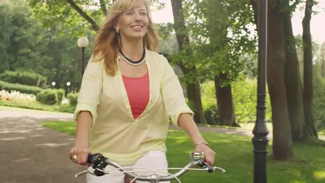 > Woman riding bicycle in coastal vacation community