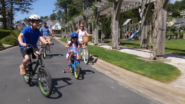 > Family riding bicycles together in coastal vacation community