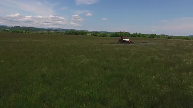 Aerial shot of tractor spraying grass seed farm