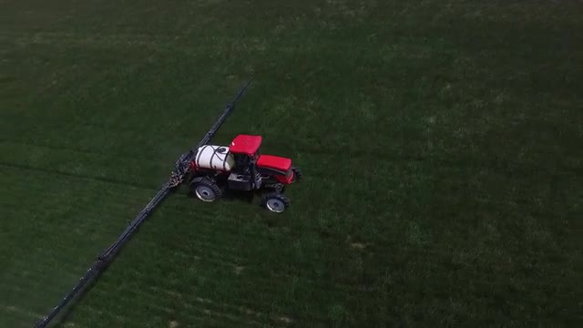 Aerial shot of tractor spraying grass seed farm