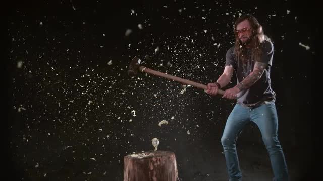 Man smashing can of silly string with hammer in slow motion, shot on Phantom Flex 4K at 1000 fps