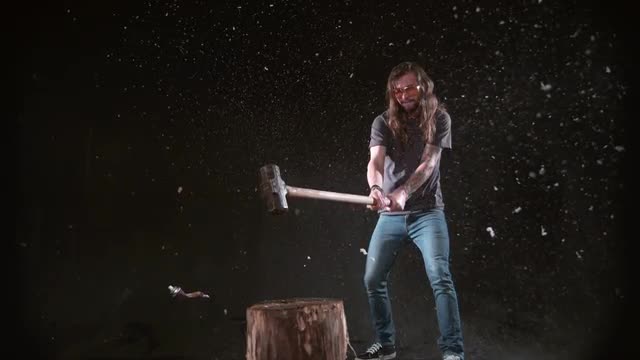 Man smashing can of silly string with hammer in slow motion, shot on Phantom Flex 4K at 1000 fps
