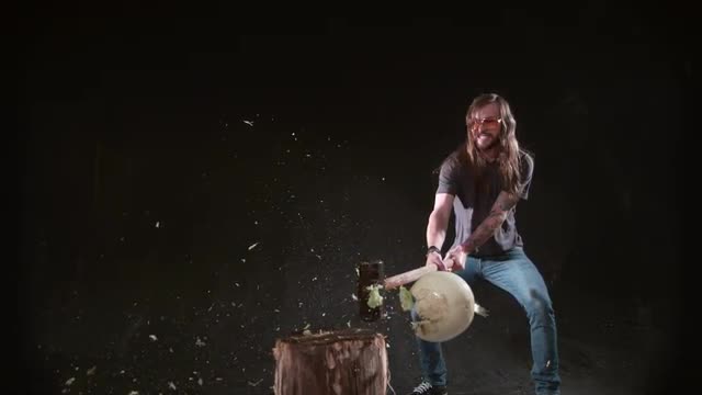 > Man smashing melon with hammer in slow motion, shot on Phantom Flex 4K at 1000 fps