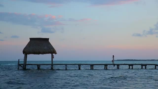 371420 - Woman walks down pier at dusk