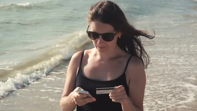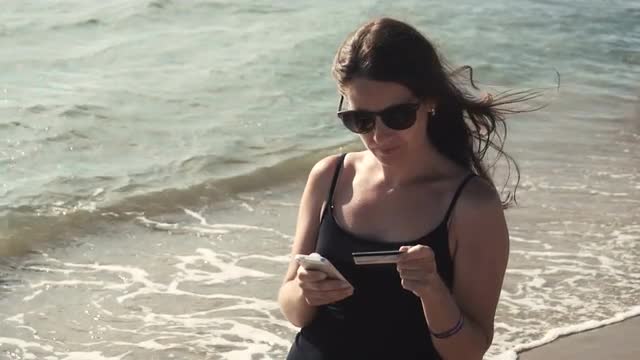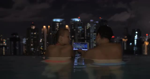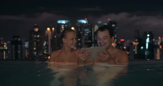 Woman uses digital tablet by pool at tropical resort