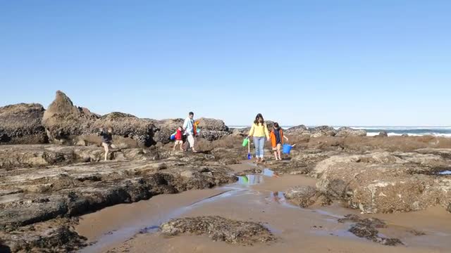 Family walking on beach with tidepools
