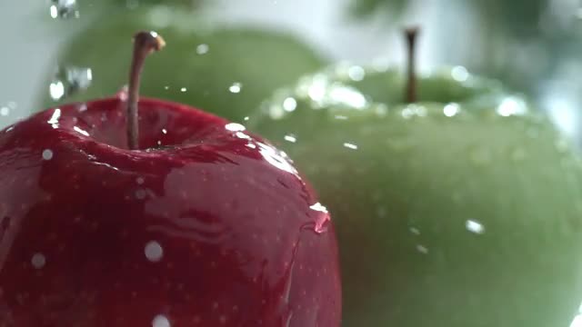 Water splashing on apples in slow motion; shot on Phantom Flex 4K at 1000 fps