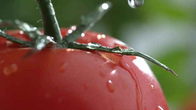 Extreme close-up of water drip on tomato in slow motion; shot on Phantom Flex 4K at 1000 fps