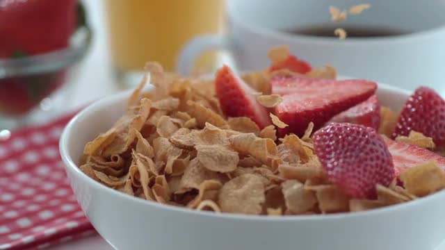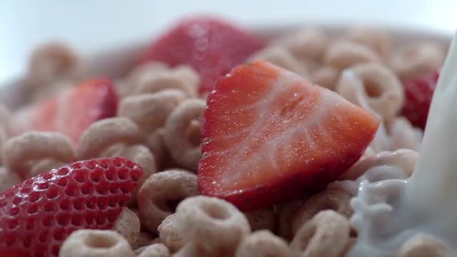 Milk pouring into cereal bowl in slow motion; shot on Phantom Flex 4K at 1000 fps