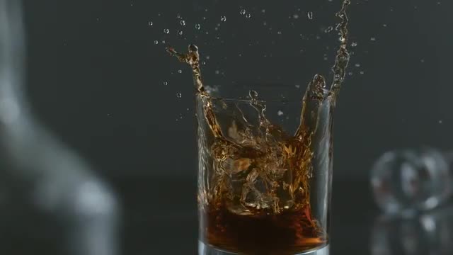 Ice is dropped into glass of whisky in slow motion; shot on Phantom Flex 4K at 1000 fps