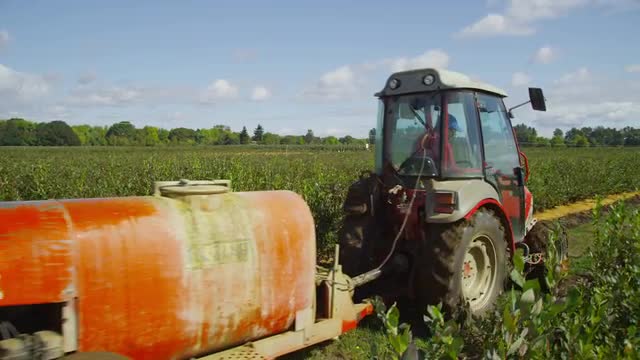 373149 - Tractor spraying blueberry field.