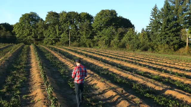 > Farmer walking and looking at rows of crops