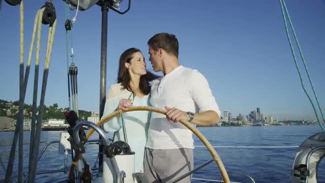 > Young couple on sailboat together.