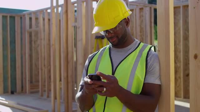 693998 - PAN MS LA Businessman talking on the mobile phone with cranes in background / Beijing, China
