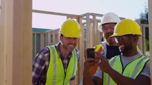 > Construction workers taking selfie with cell phone