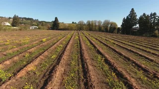 996337 - Aerial view of tractor on farm driving down rows