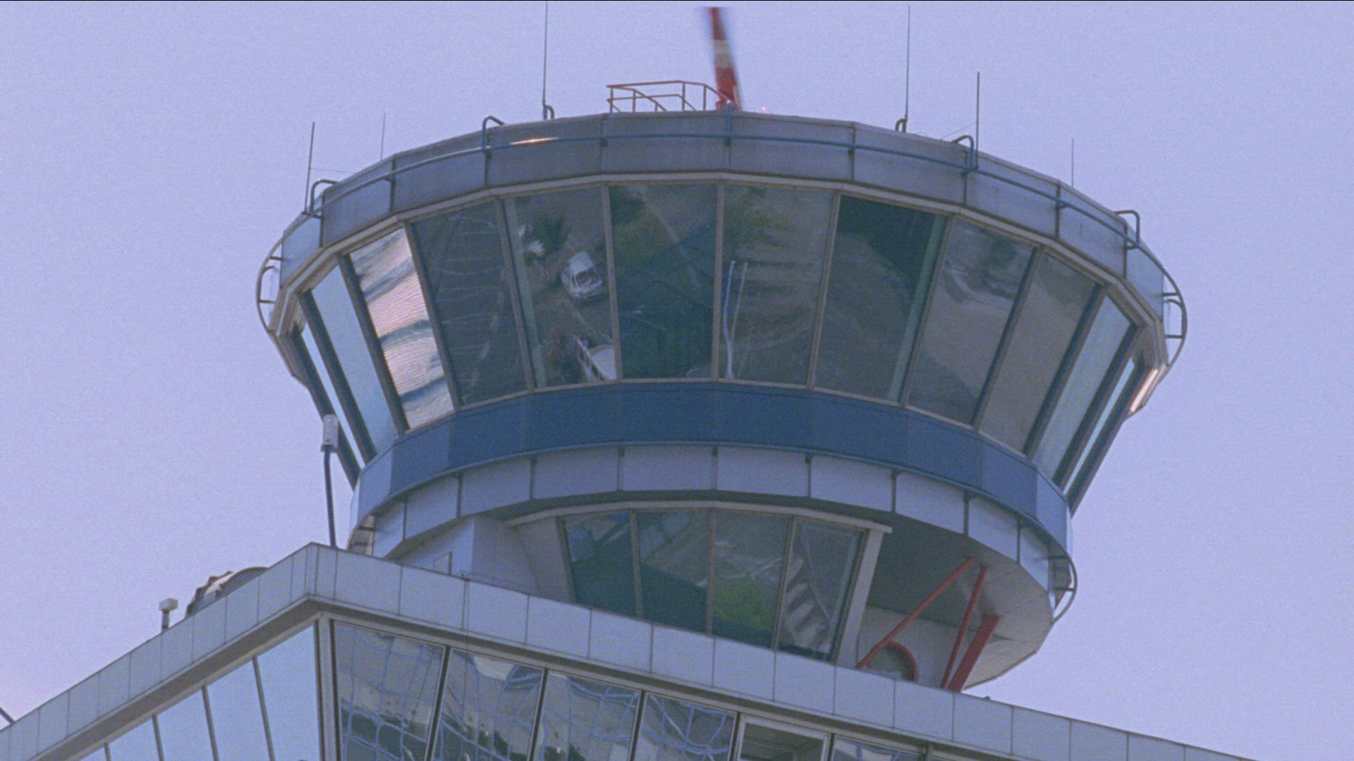 Control tower at the airport with blinking lights in a daytime. Tower with large windows in order to see and control plane traffic