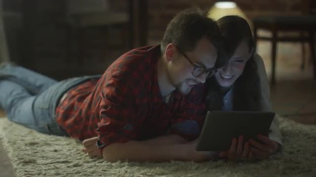Young man and woman using tablet computer at the railway station in the late evening while waiting for the train