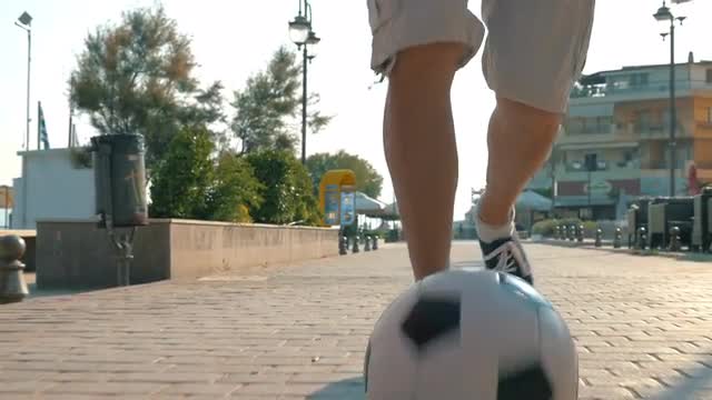 Steadicam shot of family spending evening on resort by playing football on the beach. Outdoor sports activity and fun on vacation
