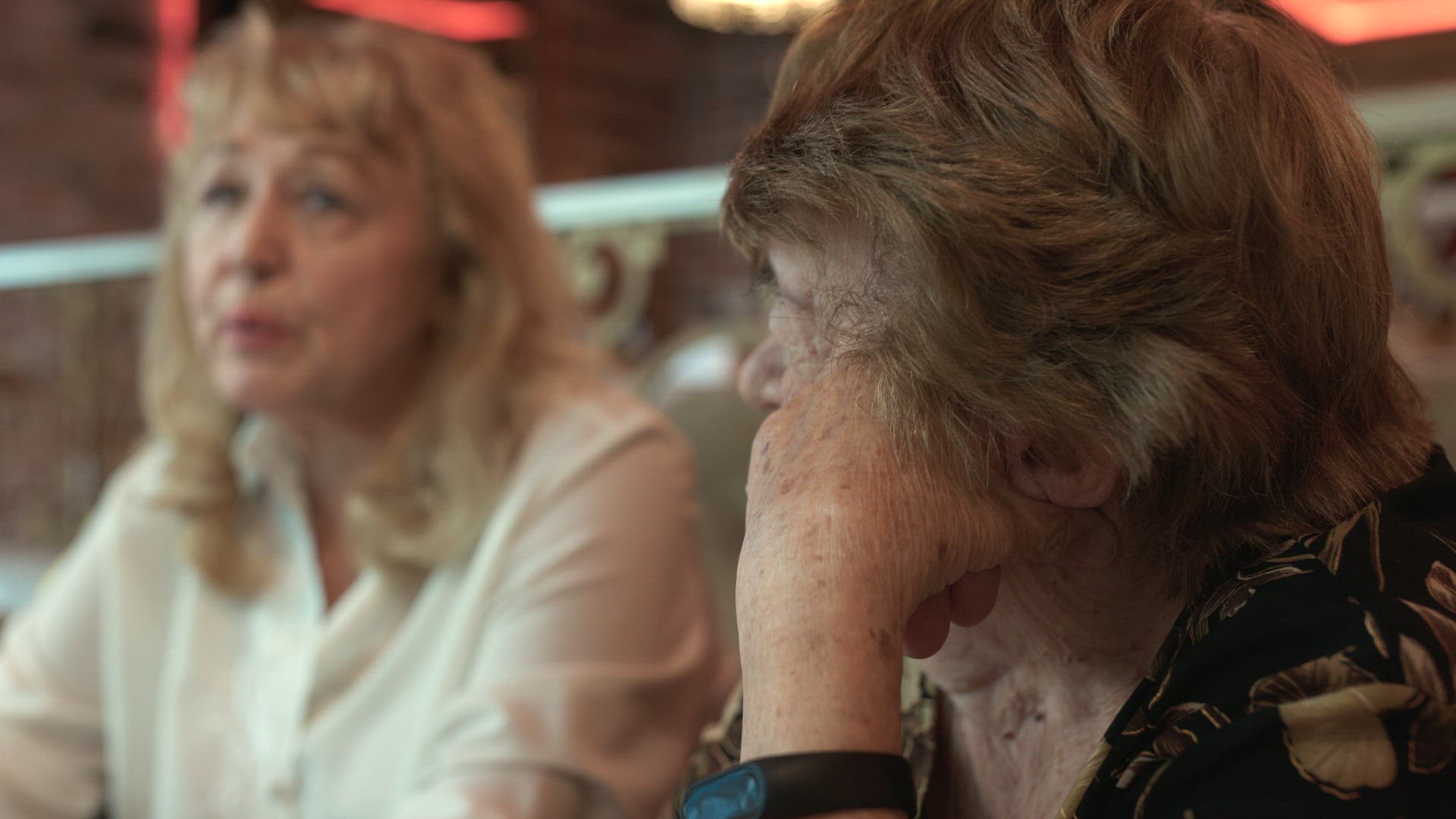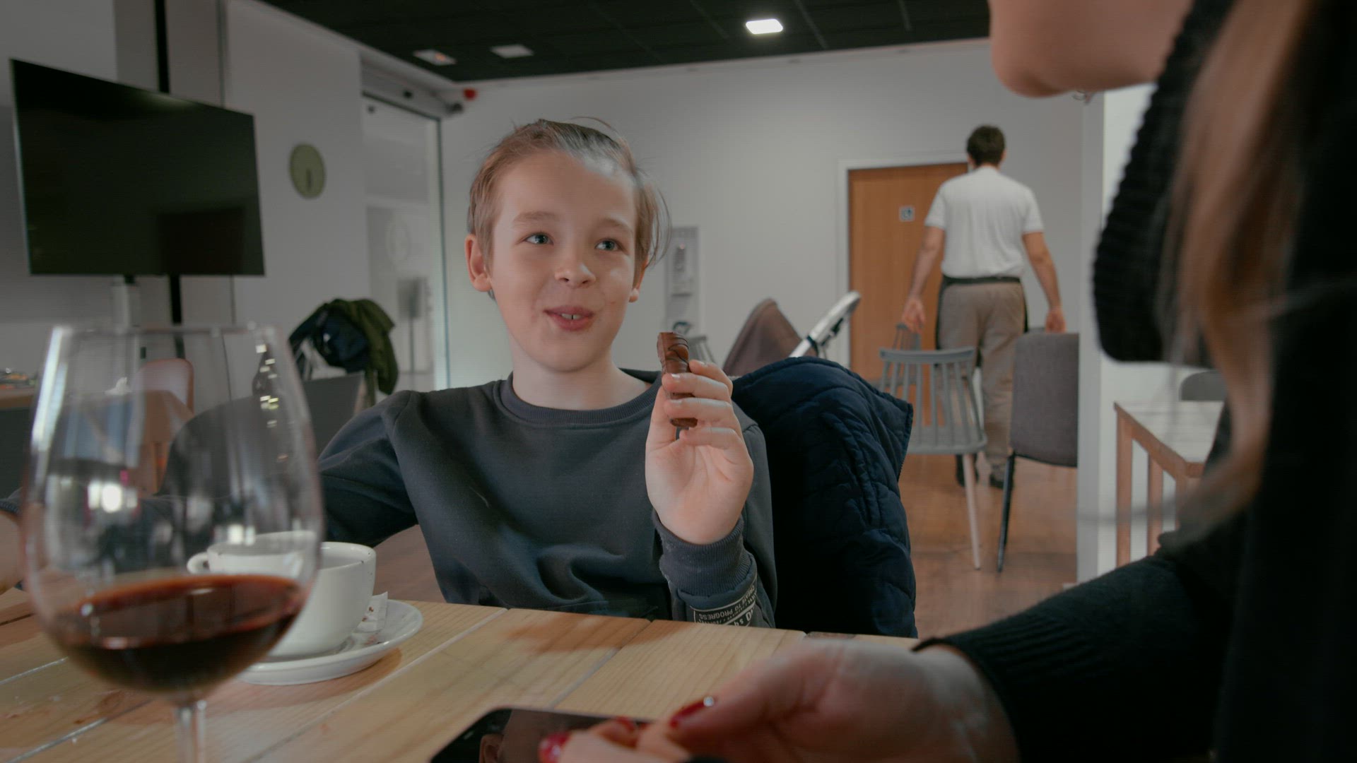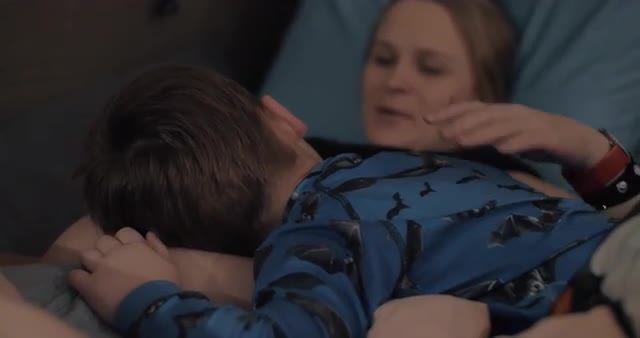 Happy family use tablet sitting on the sofa at home, little boy kisses her grandmother and mother, mother kisses son in return