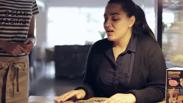 Young man and woman watching something using cell phone and discussing it during tea break in cafe. Street with people reflecting in glass