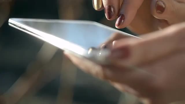 Close-up shot of an elderly woman in glasses spending leisure time with digital tablet. She using pad and wireless headphones to listen to music ot watch the film