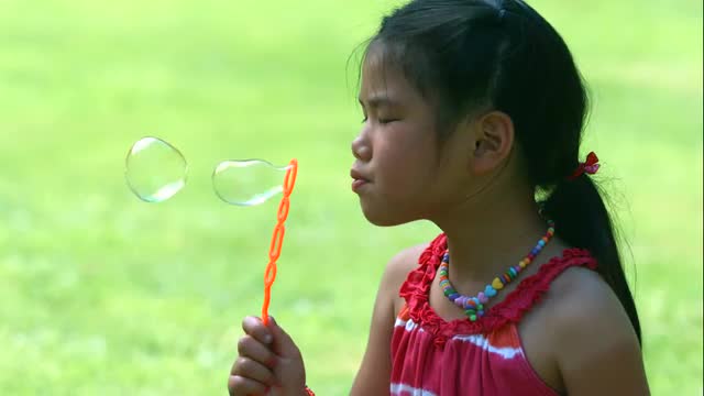 Young girl blowing bubbles, slow motion. Shot with a Phantom Camera at 1000 frames per second.