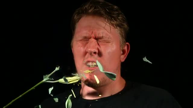 Flower frozen in liquid nitrogen hit man in face, slow motion. Shot at 1000 frames per second on a Phantom Camera.