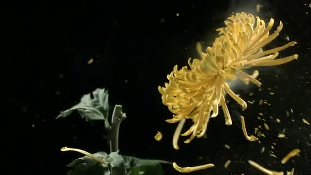 Flower frozen in liquid nitrogen explodes in slow motion. Shot at 1000 frames per second on a Phantom Camera.