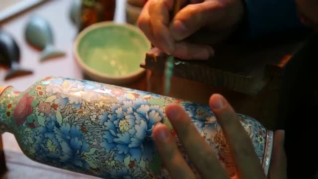 Beijing, China - December 6, 2013: Factory worker paints vase
