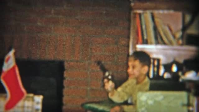 1954: Older brother teaching toddler about how to play with guns indoors.