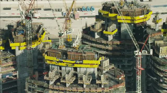 > Aerial construction cranes Dubai development UAE
